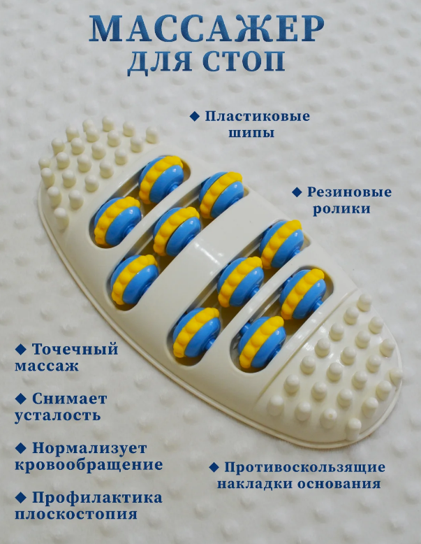 Массажёр для ног с роликами и массажными шипами. Подходит для ежедневного использования дома или в офисе. Стимулирует биологически активные точки на стопах, помогает снять усталость, напряжение и улучшает общее самочувствие. Лёгкий и прочный, занимает минимум места, прост в применении – достаточно поставить ноги и перекатывать их по роликам.