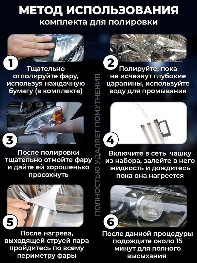 При помощи набора для реставрации фар можно удалить налёт, микротрещины, царапины, сколы, желтизна, мутность, повреждения лакового покрытия. Одного баллона специальной полировальной жидкости хватает на несколько десятков фар. Благодаря специальному полировальному составу удаётся добиться оптимальной температуры. Восстановление пластиковой поверхности происходит под воздействием паров жидкости для восстановления фар, которые образуются в парогенераторе.