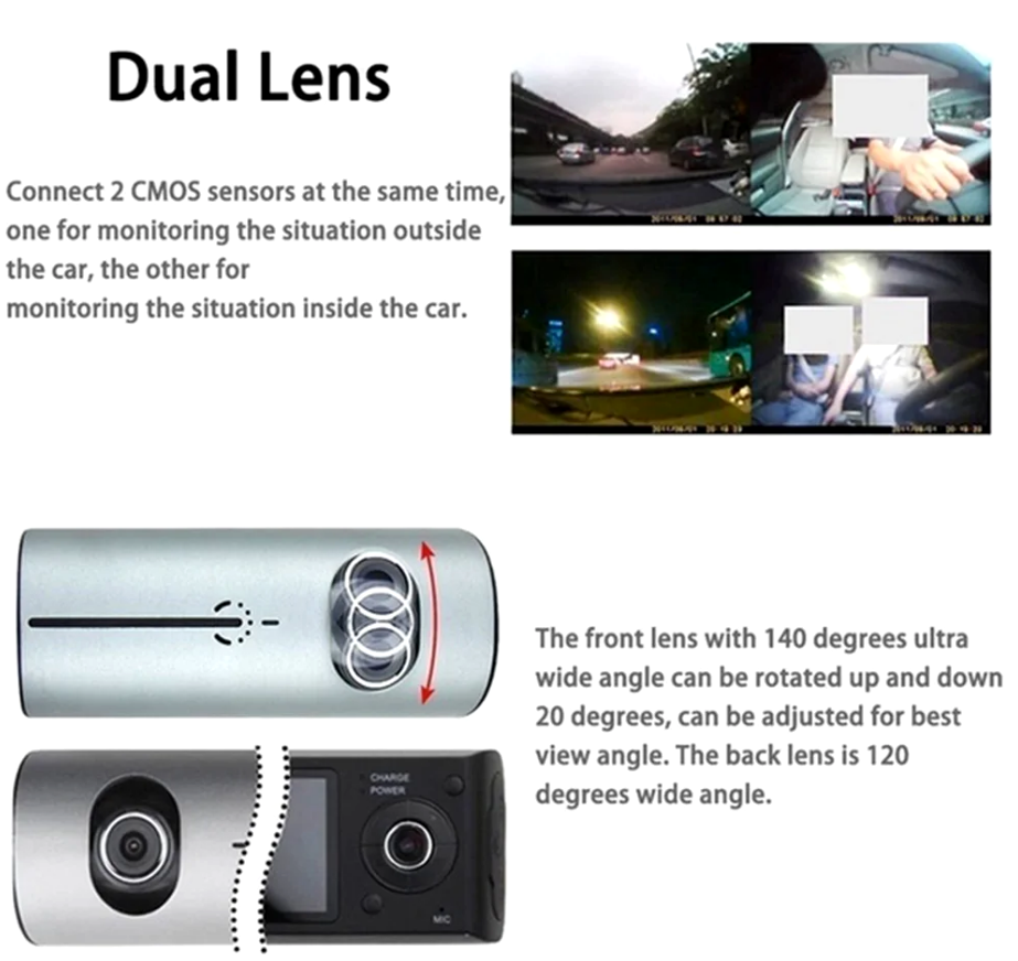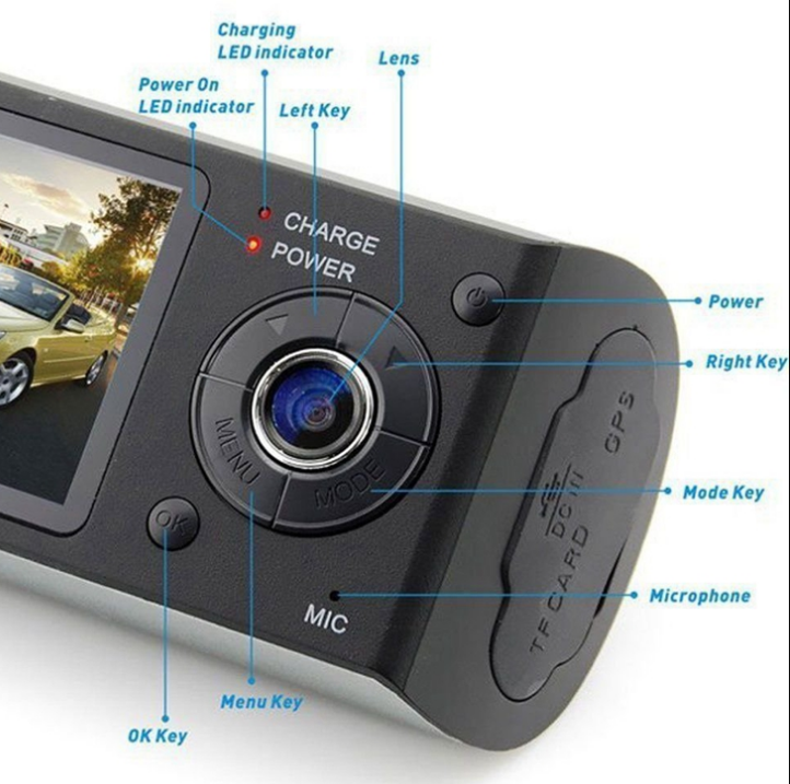 - Циклическая запись / GPS-трекер / G-сенсор / Двойной объектив / Запись цикла / Отображение времени и даты