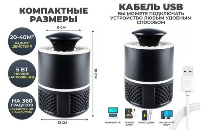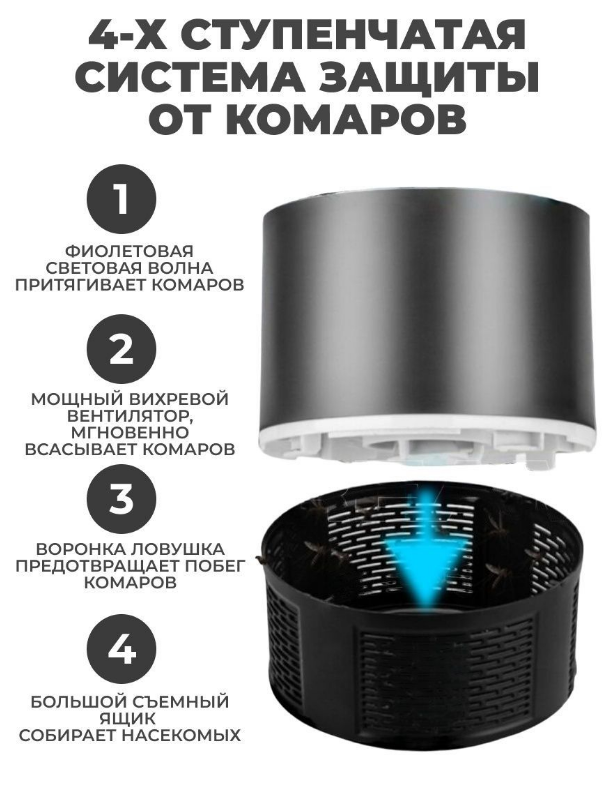 Принцип работы: ультрафиолетовый LED-свет привлекает комаров → встроенный вентилятор засасывает их внутрь